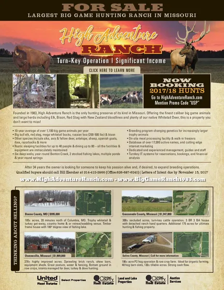 Founded in 1983 High Adventure Ranch is the largest big game hunting ranch in the state of Missouri. It is a turnkey operation, with significant income.