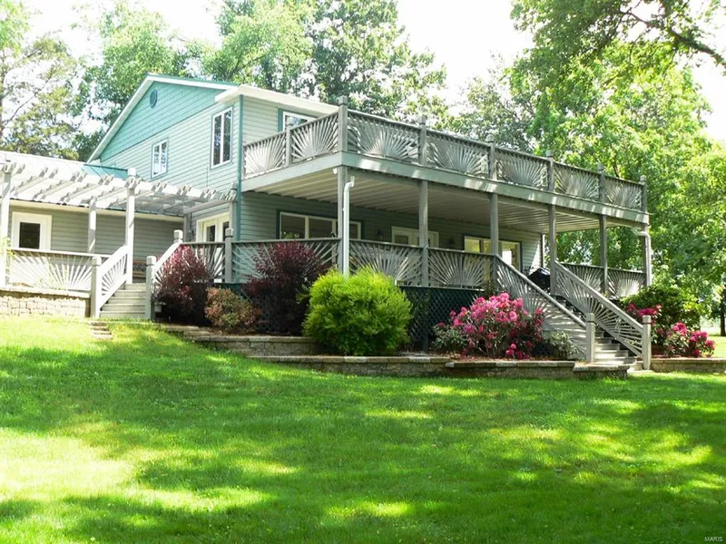 This home is situated on one of Missouri's most extraordinary natural locations, commanding 1/2 mile+/- of the beautiful Meramec River. Shaded by mature sycamores, oaks & maples, the house enjoys sparkling vistas from 35 feet above the river. Inside, every window reveals grand views of the wondrous Ozark foothills - river to the south & west, limestone bluffs to the east, and wooded, rolling hills to the north. The woods are a maze of manicured trails providing easy access for wandering the property, enjoying the wildlife as the river beckons for recreational swimming, fishing, and boating. The deck is a covered, 14'x40' veranda which faces the river and is ideal for entertaining a dozen or more guests. A special feature of the home is the circular traffic flow that allows visual access to the extra-large window views from all sides of the home. Up to three 2-acre +/- parcels above the flood plain may be used to build additional waterfront homes. More info visit: meramecriverhome.com.
