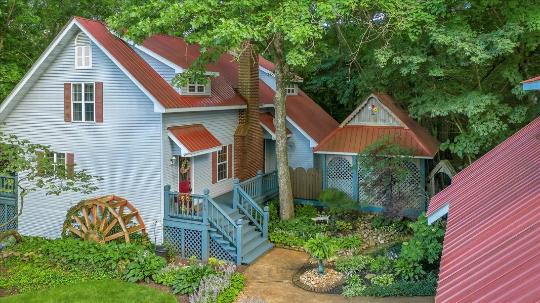 This exceptionally well-maintained 3br/4bth home sits on 5+/- acres and offers a scenic park-like setting with spring-fed creek, rolling lawn, wooded trails, treehouse, and bonfire sites. The front porch provides a serene place to sip the mornings coffee while enjoying the sounds of nature. The shaded back deck is perfect for entertaining and features a Gazebo with the added bonus of a hot tub for relaxing after a day's work. There is an oversized 2-car detached garage with landscaping that includes a travel path and gated archway in the back entry. The main floor gives way to 20 ft ceilings and custom wood features and includes an open kitchen with a 4-seat island, combined great room and dining space, brick fireplace with wide mantel, den, bedroom with private bath, second bath, and laundry. Two large bedrooms, each with their own baths, and a railing lined loft comprise the upstairs. ...