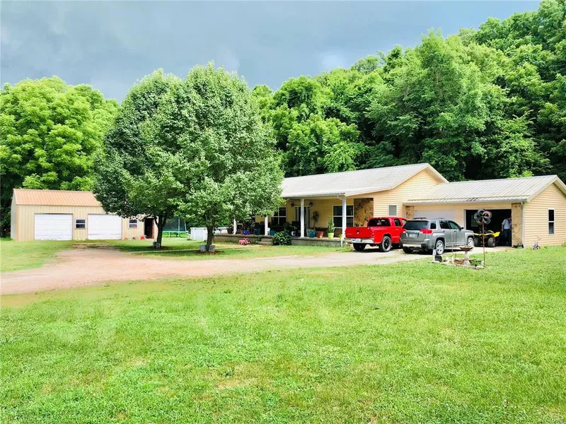 Custom built completely steel framed house with steel siding and tin roof. This home features a covered front porch that leads into a beautiful, open living area with vaulted ceilings. Kitchen has plenty of custom cabinets and an island with a flat cooktop and sink. Utility room has plenty of space for washer, dryer, and a freezer. Master bedroom has large walk-in closet. Master bath has corner Jacuzzi tub and corner shower. The basement has been steel framed for 3 additional rooms, large living area and bathroom. The home has electric and wood/pellet heat to keep you warm on cold days and Central Air for the warm days. There is a 2 car attached garage with openers & also a 2 car detached garage/workshop with openers. Just a few miles from town this property is perfectly located out in the country off blacktop. Above ground pool with deck is a great place to hang out not to mention the natural running spring in the backyard that offers a park like setting. Schedule your showing today!