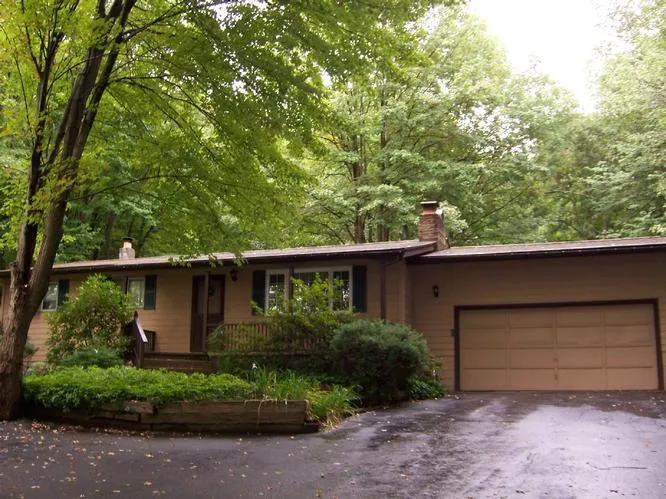 Private Setting – 2 Bedroom, 2 bath Ranch on 3.525 acres. Finished lower level with bar, wood stove, & outside entrance. Large master bedroom with 2 closets. Cut stone fireplace with gas insert in living room. 6 Person hot tub. 2-car attached garage. Enclosed porch & open deck. MLS 94320
