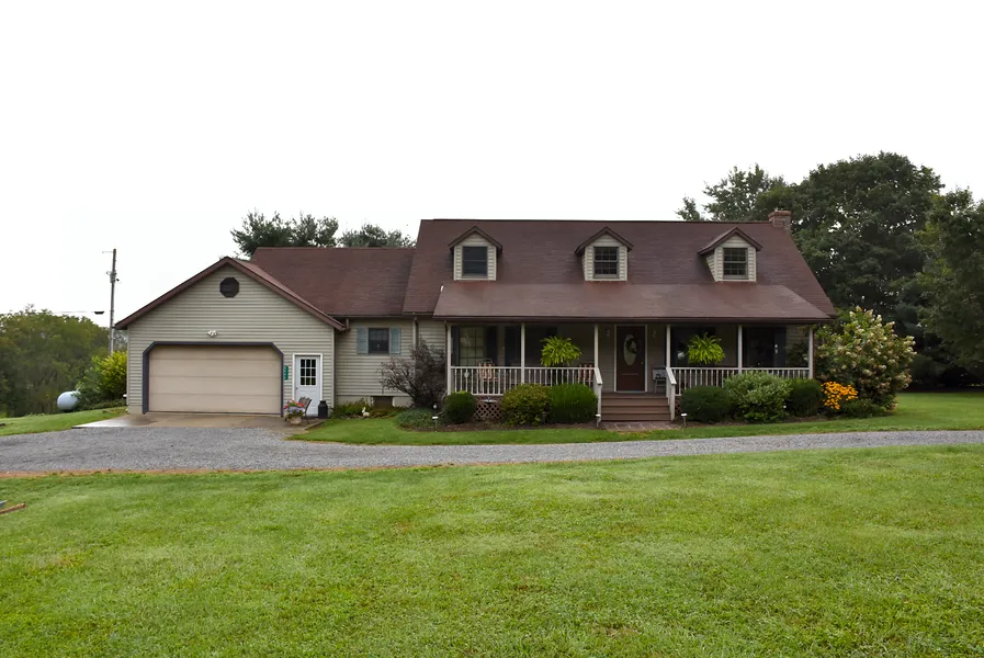 Move-in ready 3 bedroom Cape Cod with an attached 2-car garage, full-length front porch, fireplace, and gorgeous cathedral ceilings located on 45 acres with spectacular hilltop views.