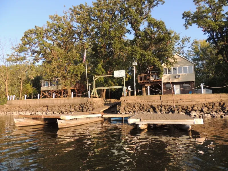 Heres a rare opportunity to own your very own mini-resort on the Mississippi River. This property boasts three separate cabins that can easily sleep more than 10 adults! All three cabins can be fully furnished including stove and refrigerator, and one cabin includes an elevator. Lots of storage available for your boating and fishing equipment. The yard here has been built up higher than the surrounding properties and is reinforced by a well-maintained concrete retaining wall. Call today for more details!