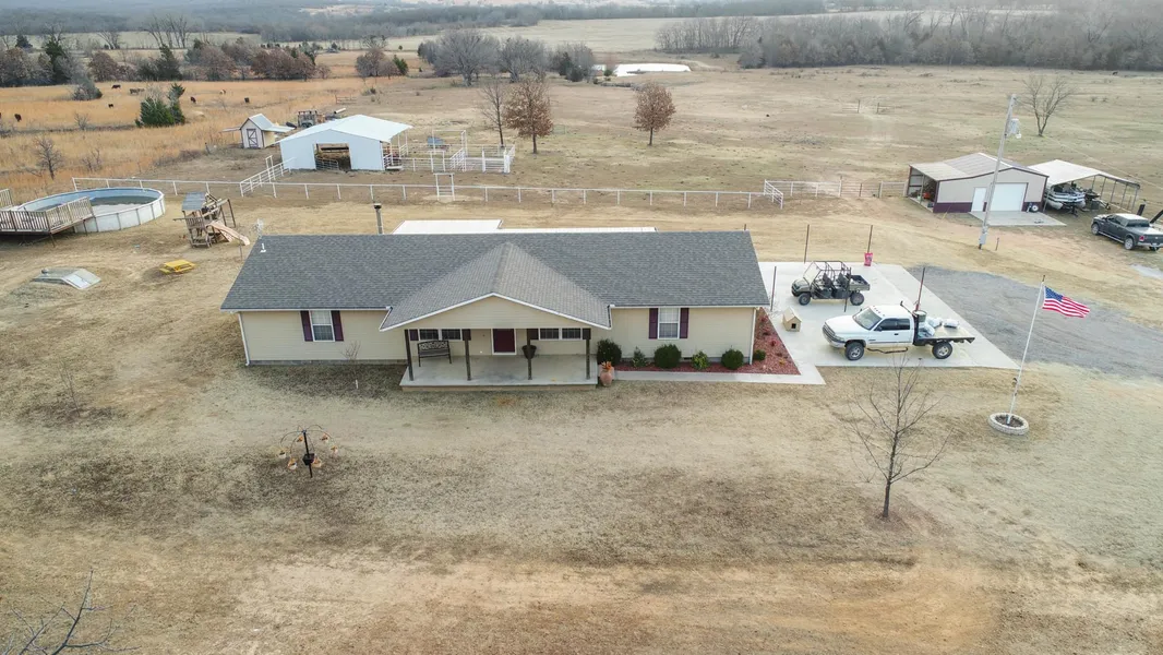 Built in 2011 this 3 bedroom, 2 bath home on 40 acres, featuring blacktop road frontage, is located just outside of Bristow, OK. This well maintained property is perfect for livestock, but with the ease of close proximity to town. The property contains a livestock barn, multiple ponds, and is cross fenced with a set of pens. Cool down during the summer months in the above ground pool with deck and covered patio area. This would make a great place to raise your family, close to town, but with plenty of space to do just about anything you would like to do. Call today and set up a private showing!