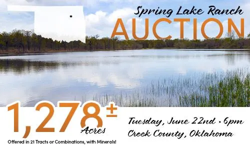 1,278+/- Acres in 21 Tracts or Combinations with Minerals! Immaculate Spring Fed Lake - 10+/- Acres Numerous Secluded Settings MINERALS INCLUDED! Well Maintained Pastures - Cross Fenced Extensive Paved Road Frontage - Route 66 & Milfay Road Less Than 1 Hour from Downtown Tulsa & OKC Excellent Hunting, Wildlife Habitat & Established Food Plots Outstanding Fishing ONLINE BIDDING AVAILABLE.