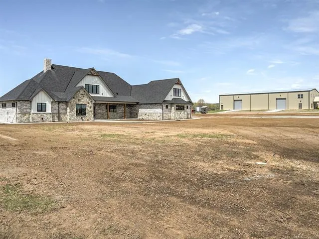 WMS Homes Custom Built on 6.5 acres m/l w/pond. Handcrafted woodwork, custom cabinetry, attention to detail throughout. Gourmet Cook's kitchen w/upgraded fixtures and appliances. You can vacation in the master bath! Covered outdoor patio with wood burning Fireplace. 7200 SF shop/office/living quarters same quality as home /2 bedroom/1 bath/living rm / laundry connections / full kitchen. RV septic/2 50-amp. 2 14' overhead doors /22' ceiling. Rural setting 12 min from downtown Sapulpa.