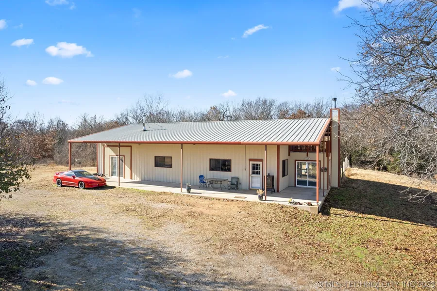Check out this awesome, secluded 4.02 /- acre property on a dead end road! This unique 30x60 steel metal, two-story house has a covered porch, outdoor safe room, a loft and so much storage! The downstairs features a sitting room off the kitchen with a wood burning fireplace and sliding glass doors to see the beautiful property. The big kitchen island is custom built wood with lots of storage and seating. Stainless steel appliances, elevated dishwasher and eye catching rustic finishes. A huge pantry/storage room with sliding mirror doors and a sitting room with a built-in bookcase and sliding glass doors leading out to the stunning in-ground gunite pool. The large living room has a wood burning fireplace and a very tall, vaulted ceiling. The upstairs features the master bedroom, a covered balcony with amazing views, full bathroom and a large loft overlooking the living room, could easily...