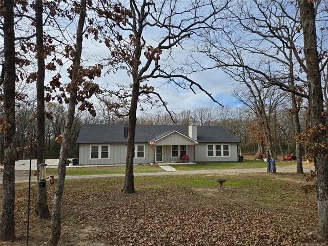 Split floor plan places spacious primary suite on one side and secondary bedrooms and bathroom on the other. Open kitchen and massive island provides a great space for entertaining. Stainless appliances and pantry makes for an efficient space. Granite counter throughout the house. Large laundry room with utility sink. Stained concrete floors in main areas and carpet in bedrooms. Full spray foam insulation and high-efficiency HVAC keeps utility usage low and provides quietness to the home. Wood burning fireplace can provide heat for the whole house. Large circle drive allows for plenty of parking. Second 200 amp service already in place for future shop. RV hookup with full utilities. House sits in the heart of the 10 acres with lots of diverse mature trees and abundant wildlife. 10 minutes to Turnpike gate, home is conveniently situated between Tulsa and Oklahoma City.
