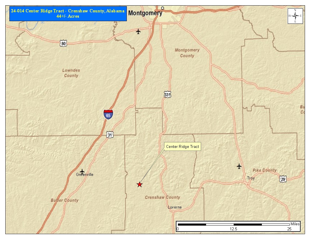 This nice tract of land is located about 10 miles northwest of Luverne and about 15 miles east of Greenville. The property fronts on Highway 11 with utilities along the road. Just off the highway is a nice open field approximately three acres in size that would make an ideal home site or a great campsite. There are three large game plots scattered around the tract two with shooting houses and one with a ladder stand. Deer and turkey signs are plentiful.