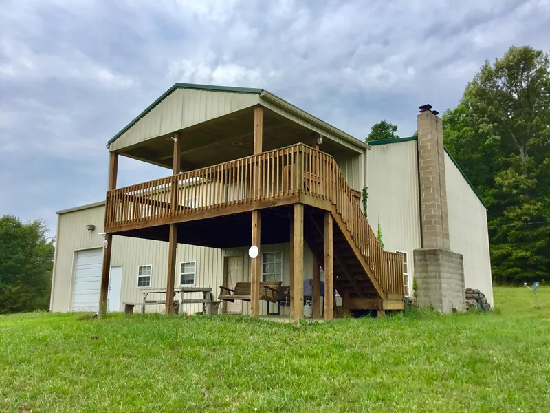 The lodge is 60'x40' with 40'x40' living area downstairs and 800 sqft of living space upstairs. The rest of the building is a 20'x40' garage area with roll up doors to move equipment in and out. There is central heat/air as well as County water. The lodge boasts a huge stone fireplace and has 6 bedrooms and 3 baths. There is a large 20'x20' deck on the second level that offers some of the most beautiful panoramic views in Western Kentucky, bar none!