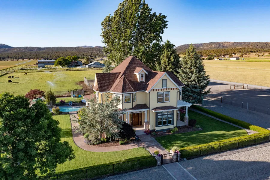 Luxury country living at its finest! This stunning Victorian 4 bed, 2.5 bath home checks all the boxes! The new inground, heated pool is the perfect place to enjoy the views of Grizzly Mt. at sunset. Views of the Sisters from both front & back covered porches. Nestled in the farmlands, just minutes from town, this irrigated acreage also offers beautiful landscaping w/ a sprinkler system that keeps everything green all summer long. For your horses, there is a large riding arena, 80'x63' barn/shop w/ 4 stalls & 6 roll up doors. Plenty of room for horse trailers & RVs. The property is fenced w/ an automated entrance gate. New chain link fencing creates a kid-friendly play area. The home has fresh paint inside & out, new LED light fixtures throughout. New carpeting & premium washer/dryer on the second floor. Your family will love the custom country kitchen, refinished butcher block island countertop & new ceramic sink. The formal dining room is just the right touch for family dinners.