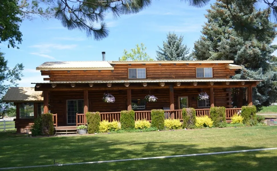 Welcome home to this impressive log home! Situated at the end of a quiet, private drive this spacious 2.7 acre lot is fenced with 2.2 acres of irrigation. and breath- taking views. As you pull up, you are greeted by a custom entry gate. Outside is everything you need, garden, greenhouse, large barn, shop, shed, carport and additional covered stall. Large back deck great for hosting and relaxing. Inside, you will find a cook's dream. Gorgeous updated kitchen with granite counters and new tile floor, newer cook-top, built-in stove, and custom themed kitchen hardware and breakfast nook . Cleanup is a breeze with the central vacuum system, and wood floors in large open main area. The charming staircase leads to a balcony overlooking the living room, and goes into an enormous primary suite. Downstairs are 2 more bedrooms, 1 bathroom & large laundry/mudroom.