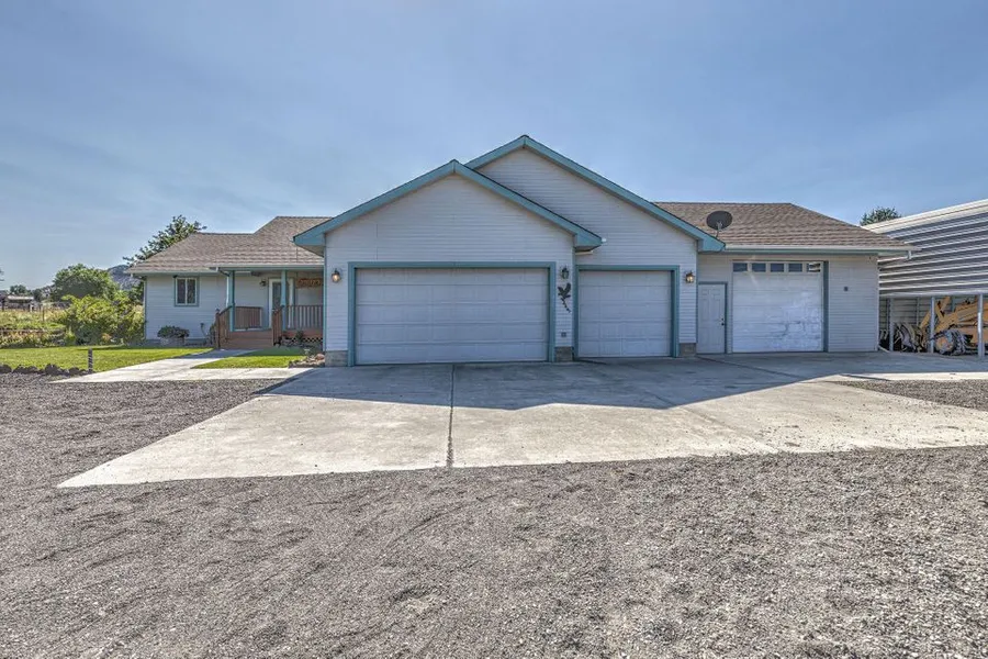 Country living yet 1.5 miles from town. 1+ acre with irrigation. 3 bedroom, 2 bath home, vaulted ceiling, open floor plan. Split plan with private, primary suite. Open and bright with windows opening up the back yard views. Back yard oasis is beautifully landscaped with flowers galore. 8' solid fencing provides additional seclusion. 3 car garage, high aluminum carport for boat or RV and additional storage building. Private well and septic. Newly painted interior, new HVAC and thermostat, new refrigerator, new garage door opener, and new pressure tank. Electric fence is included, including charger along with irrigation pods.