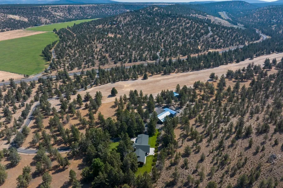 Custom home, shop, hanger, grass field/airstrip on 41 acres with 26 acres of ground water rights (well). Airstrip has been hayed in the past and could easily be converted to pasture. Ranch style home is single level, 2198 sq ft, 3 bedrooms, 2 bathrooms, open floor plan and quality finishes throughout. Chef's kitchen with breakfast bar, pantry and granite countertops. Dining area and large living room with vaulted ceilings and wood burning fireplace easy for entertaining. Terrific outdoor living with covered deck, patio and landscaped yard with sprinkler system. Two car garage attached with breezeway. Shop includes two storage rooms, 3 bays and an RV bay. The setting is private, close to town and about 15 minutes from Prineville Reservoir.