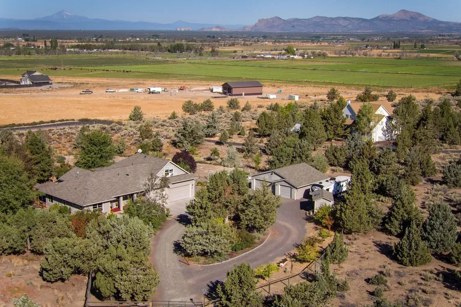 Custom 2279 sq ft home situated on 4.84 acres with beautiful Smith Rock and Cascade Mountain Views. The inviting great room design features vaulted ceilings, propane fireplace, and a built-in entertainment center, creating an ideal setting for both everyday living and entertaining. The kitchen offers new quartz countertops, stainless steel appliances, a breakfast bar, and an adjacent dining area, complemented by hardwood floors throughout. Main level primary suite provides comfort and privacy with a tile shower, and walk-in closet. Home has a utility room, 3rd bedroom/Office and Bonus Room approve garage. Outdoor living is enhanced by a covered front porch and a rear patio with hot tub, landscaping, a tranquil water feature. Additional amenities include a triple attached garage, detached three car garage/shop, raised garden beds, two RV hookups, and a fully fenced, private gated setting, all located in a quiet neighborhood with convenient access to Redmond, Prineville, and Bend.