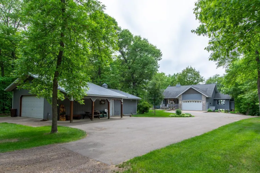 Meticulously built and cared for one-owner home is privately tucked in on approx. 2.94 acres with 130 ft. on Lake Edward- level frontage and sand bottom. Home features efficient in-floor heat on both main and lower levels, four season porch with wood burning fireplace, master suite with walk-in closet and heated tile floor bathroom, sauna, living room with expansive lake views and gas burning fireplace.The lower level has large wet bar for entertaining, family room with lake-view windows, builtins throughout, tons of storage, and attached heated garage. For the guests the property boasts and an additional 28x48 pole building that includes 24x24 guest quarters that includes 3/4 bath and kitchen, and covered porch. The grounds are nicely landscaped with in-ground sprinkler system, and fire pit.