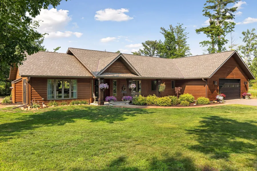 Nestled between three lakes in the heart of the Lakes Area, you will find this exceptional, private retreat on 2.91 acres with 36ft of frontage on Bass Lake. Handsome, one-level rambler with an outstanding, open floor plan in turn-key condition. Rich in details with high quality finishes, vaulted ceilings, freshly painted walls, enameled cabinetry, hickory flooring & stone gas fireplace. The expansive floorplan offers 3 bedrooms, 3 baths, great entertaining spaces & easy flow to the outdoor patio & decking with beautiful walkways over custom landscaped ponds & natural stone waterfalls. Generous sized chef's kitchen with pantry, stainless appliances, center island, ample cabinetry & soap stone countertops leading to a wonderful sun room with walls of windows. Spacious owner's suite with luxury bath, soaking tub, walk-in glass shower & heated floors. Attached 2-car plus detached 2-car garage, both heated, offering additional storage space. Public access to Gull Lake is less than 1-mile.
