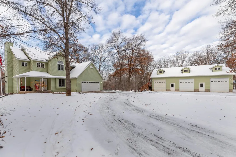 Beautiful 4 bedroom, 4 bath home with 2 car attached heated garage sits on private nicely wooded 2.5+ acre lot. And who wouldn't love an additional 54x36 insulated heated shop/garage with zone in-floor heat and upper insulated area for office/studio. Home features large media/theater room, kitchen with stainless steel appliances and hardwood floors, owners suite with tray ceiling, walk-in closet and private bath with jetted tub and tile shower, lower level bedroom suite with private bath and walk-in closet, large backyard deck, and covered front porch.