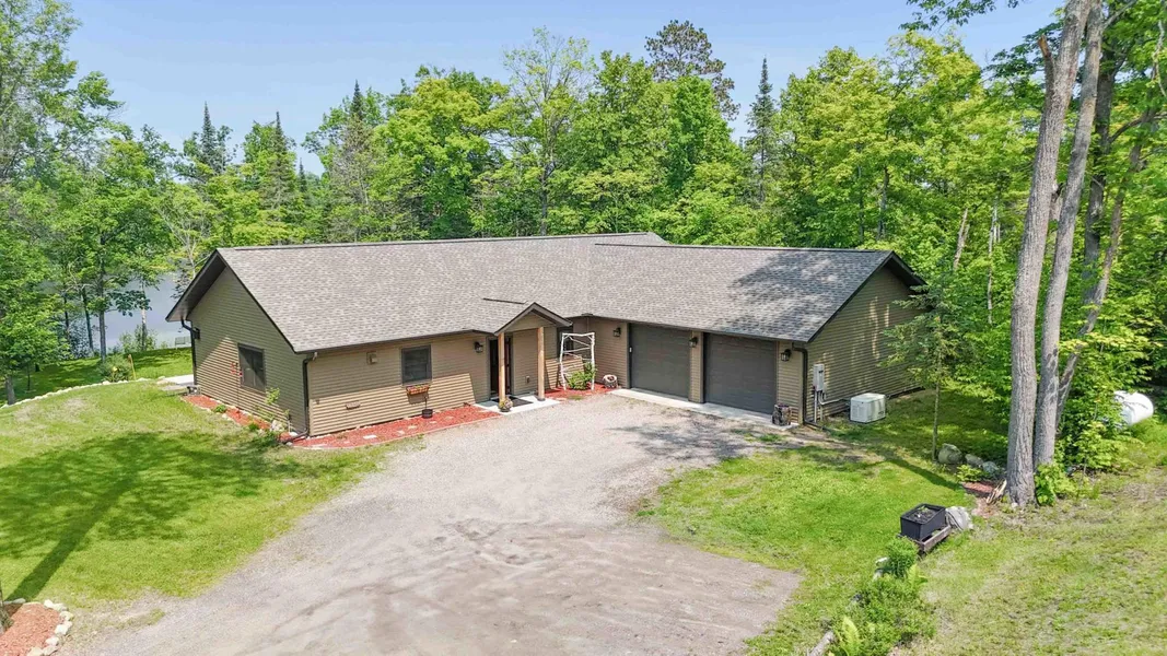 Welcome to your private slice of paradise on the peaceful shores of Twin Lake! Built in 2020-21, this meticulously maintained 2.04-acre property offers exceptional comfort, thoughtful design, and year-round enjoyment with nearly 240 feet of shoreline. The main residence is a beautifully appointed 3-bedroom, 2-bathroom home, all on one level for easy living. Designed with accessibility in mind, the home features wide doorways and hallways, and seamless, gentle access all the way to the lake. While in-floor heating runs throughout the house and attached two-stall garage, the home is also equipped with a forced air furnace and central A/C for year-round climate control. Need space for more family or guests? This property has a year-round guest house with a huge living room, as well as an additional (1) bedroom and () bath. Extra amenities include an additional garage with oversized door for RV/camper storage, a camper-ready parking pad with electric hook-up, vaulted wood ceilings in the living room, high speed fiber, and a whole-home automatic propane generator for peace of mind. This rare lakefront gem combines accessibility, functionality, and natural beauty in one perfect package. Whether you're looking for a forever home, a peaceful retreat, or a space to entertain, this property checks every box.