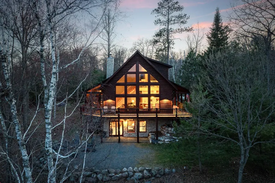 Welcome to the Whitefish Chain of Lakes on Wilderness Trail. This exquisite hand-hewn log accented home features four distinctly appointed bedrooms and four baths. Every detail was meticulously designed to leverage the natural beauty of the 2 acres of land. Features include an open floor plan with two story great room/kitchen/dining area accented by a floor-to-ceiling stone fireplace perfect for entertaining, granite countertops, cherry hardwood cabinets, rustic cherry floors, main-floor primary suite, main & upper floor laundry, new Emtek hardware throughout, spacious three season screened porch with attached wrap-around deck, outdoor hot tub/spa, generator electrical hook-up, walkout lower level with Knotty Alder built-ins, 9 foot ceilings and custom shiplap paneling that you must see to appreciate. Enjoy two covered boat slips, land includes 2 lots, extra lot is buildable, nearby trails and community center for pickleball and fitness, all just minutes from Crosslake. The updates include a new roof, fresh paint, and exterior staining. You will notice the superior quality of the materials and craftsmanship at every turn as you enjoy quiet morning sunrises, starlit nights and lake days.