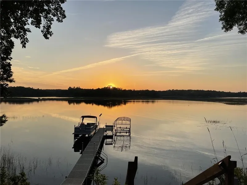 Welcome home to this beauty offering year-round living on Borden Lake, large and deep enough for all your recreation needs & just minutes from Garrison. Built in 2007, this home blends modern conveniences with rustic, log cabin-style finishes. Enter the main level and immediately enjoy the amazing west facing "infinity" lake views featuring colorful sunsets & nothing but nature. Gleaming laminate flows through this open concept boasting a large kitchen with tile backsplash & many cabinets, an 18x17 living room, 18 x17 corner porch and BR on the main. The cabin feel continues downstairs with knotty pine walls/ceilings, 2 more bedrooms, bath and family room with walkout to a large paver patio overlooking 109 ft of private lakeshore. Forced air heat /AC, lower level in-floor heat. New roof (2023), water softener ('22 ), windows ('10) & recently landscaped. City sewer! 2 sheds & kennel. Included with acceptable offer: 68 ft dock and lift, 2 single log framed beds, main level bed, refrigerator in shed. WIFI direct cable with SCI Broadband & Direct TV installed. Move-in ready -- Start making memories!