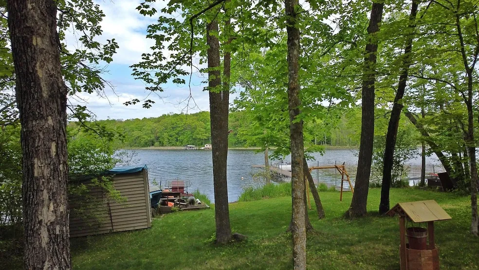 Welcome to your TURN KEY log cabin on Borden Lake! This one-owner log home has been well loved & cared for and is ready for its new owners. Nicely situated along a no-through road, this property has lots of beautiful mature trees providing 1.4 acres of park-like privacy. Offering 118ft of sandy, north facing lakeshore, dock and breathtaking panoramic views. This 3 bedroom, one bath cabin presents an authentic Up-North feel with an open living room, dining room and kitchen layout. Enjoy the year-round cabin life with ELECTRIC and pellet in floor heat; or stay extra warm and cozy when you cuddle up next to the beautiful stone fireplace that is ready for use. Sold mostly furnished and also includes 2 paddle boats, a sail boat and pontoon boat (no trailer). The 2-1/2 car garage is heated/insulated and the grill, log splitter, Kawasaki mule and utility trailer are all included as well. Com...