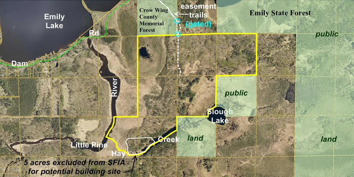 Singular opportunity to own a secluded expanse of land on the Little Pine River, Hay Creek, and Slough Lake at the outskirts of Emily. Hilly wooded upland slopes down to low wetlands along the river and lake. Approx 3,600 feet of undeveloped/wetland frontage create a peninsula overlooking the river and creek in the south/southwest, and approx 460 feet of undeveloped/wetland frontage overlook the lake in the southeast. The property adjoins thousands of acres of public land, including public Crow Wing County Memorial Forest land and public Emily State Forest land. Access is via easements of record from Dam Rd, and an easement trail continues into the north portion. Trails throughout make other portions of the land accessible as well. The property is SFIA enrolled (aside from a five-acre site for building along the creek), which provides annual income benefits as part of the MnDNR Forest Stewardship Program. Public access to Emily Lake is only about 1 mile away. Snowmobile trails along State Hwy 6, Dam Rd, and continuing up through the public forestland are part of a 95-mile system of trails maintained by the Emily-Outing Snowbirds. Downtown Emily is less than 3 miles away for groceries, shopping, dining, and community events. This property is rich in wildlife, rich in privacy, and rich in opportunities!