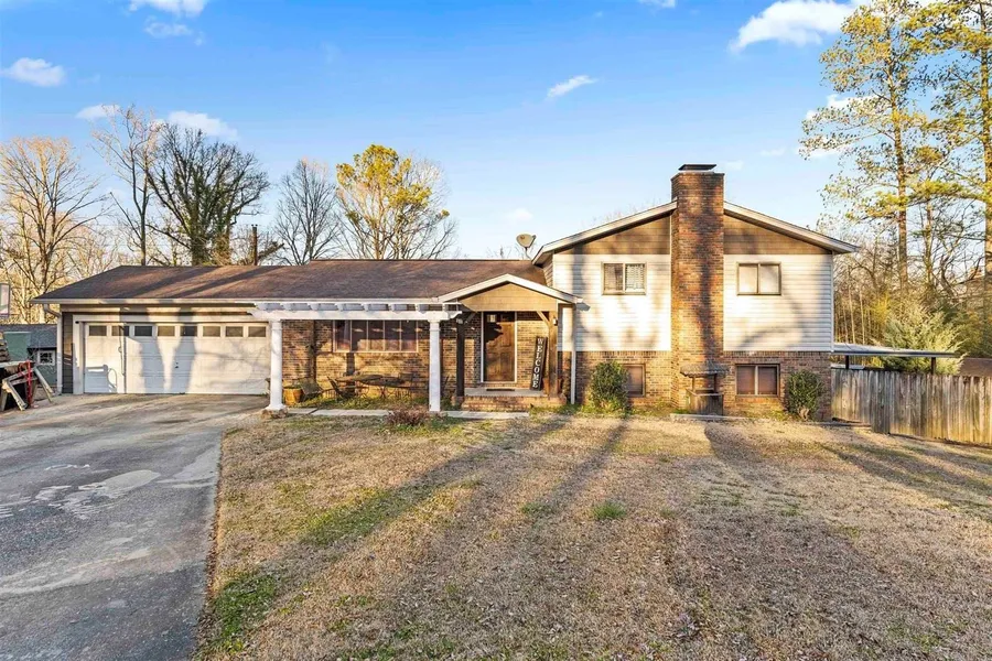 Tri-level home located in Cullman High School Estates! The main level offers a spacious living room, kitchen, and dining area. The kitchen is equipped with a stainless steel wall oven and microwave combo, dishwasher, and an electric cooktop set in an island featuring a live-edge wood countertop. The upper level includes three bedrooms and two full baths. The lower level features an additional bedroom and full bath, and walk-in closet, complete with a cozy wood-burning stove. A sliding glass door from the lower-level bedroom leads to an outdoor entertainment space with a covered bar area — perfect for gatherings. The exterior showcases a combination of brick and wood siding, a fenced backyard with a wooden storage shed, and a two-car garage. Conveniently located in walking distance to the High School and downtown shopping!