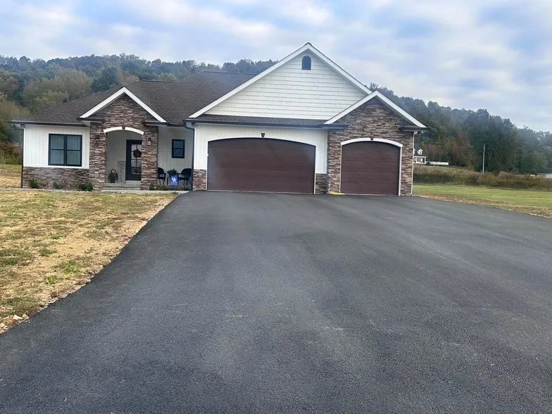 Step into this remarkable new construction home where exceptional curb appeal greets you with custom stonework, stamped concrete walkways, wooden stained posts, and beautifully designed garage doors. This thoughtfully designed residence features an open floor plan concept that maximizes natural light throughout the living spaces, highlighted by a full mantle fireplace and soaring vaulted ceilings in the living room. The user-friendly kitchen serves as the heart of the home, showcasing an island sink, soft-close cabinets, and elegant granite countertops. Flow seamlessly from the kitchen to the dining room, which opens to a covered back porch complete with stamped concrete flooring - perfect for entertaining or quiet relaxation. The home's practical layout places two guest bedrooms at one end, separated by a well-appointed guest bathroom featuring quality fixtures and finishes. Double doors reveal the spacious primary bedroom suite at the opposite end, offering a true retreat with its generous proportions. The primary bathroom provides luxury with a jetted garden tub and an impressive forty-eight inch ceramic tile walk-in shower, complemented by dual vanities with granite countertops and an exceptionally large walk-in closet. Additional conveniences include an attached three-car garage accessible from the kitchen, complete with pull-down attic storage. The property features flat, usable land with city water, fiber optic internet service, and a private septic system. A prefab storage building provides extra utility space. Located just minutes from Burkesville's welcoming community atmosphere, the Cumberland River, and Dale Hollow Lake, with convenient access to the Cumberland Parkway and Columbia's Lindsey Wilson College approximately twenty minutes away, this home offers both tranquility and connectivity.