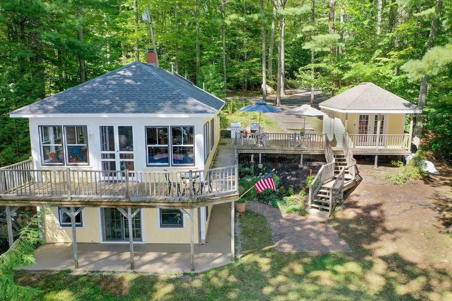 Is living at the lake a dream of yours? Imagine falling asleep to the sound of loons, watching a stellar sunrise from your living room, a sunset dinner cruise on your boat that is docked in your front yard AND you are only 2 HOURS from Boston or only 11 miles from the Portland JetPort! 45 Highland Shore Road can turn your lake life dream into your lake life reality. 90 feet of owned waterfrontage on beautiful Highland Lake, with the water access being a combination of sandy and rocky. There is a private boat launch for the neighborhood nearby. Freshly painted a cheerful cornstalk yellow, this adorable cottage has had so much work already done for you so that all you have to do is pack your bag and go relax! The roof was newly shingled, three new parking spots were added, the expansive living room with French doors overlooking the lake just had the wood floors refinished and new lighting installed, most of the interior has been freshly painted, plus new flooring in the foyer and a bedroom. The primary bedroom faces the lake with walk outdoors just a few steps to the water's edge. This charming year-round cottage has a large storage shed that could easily be converted to an outside dining area overlooking the lake, so many options. The sellers enjoyed almost every meal outside on the oversized deck just taking in the lake views and the overall sense of peace and tranquility. You could be dining on this deck soon! Lake, Love, Life!