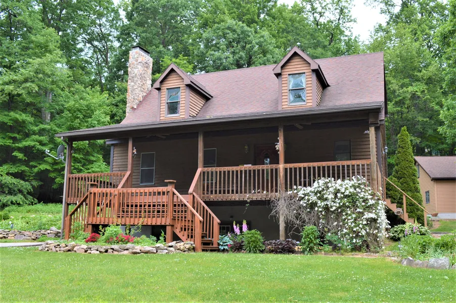 Enjoy privacy and seclusion in this woodland retreat! Features a cedar sided cape cod style home with a main level bedroom and full bath, a large covered front porch from which to enjoy the view and a rear deck. Storage will not be an issue with lots of closets, a full walk out basement, a very oversized 28 x 40 3 car garage with a third full bath and woodstove as well as a 24 x 48 pole barn and a yard shed. The lot features many mature trees, a garden area and plenty of room to roam.