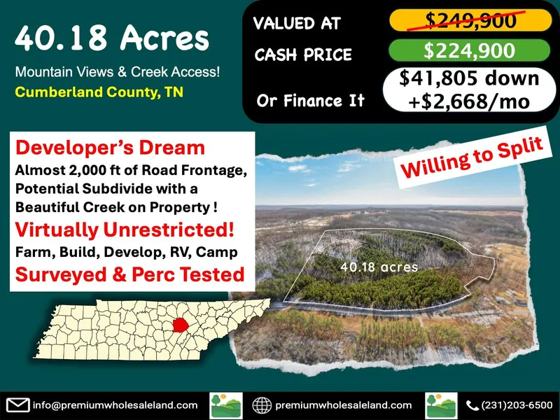 Embrace the serenity of nature with this expansive 40.18-acre wooded lot in the heart of Cumberland County. Nestled along Bolin Rd, this property offers a unique blend of natural features, mountain views, and development potential just 22 minutes northeast of downtown Crossville. The land features Pancheoncamp Creek, adding a serene water element to the property. With paved road frontage and power running along Bolin Rd (not yet connected), the groundwork is laid for building your dream retreat. The property boasts diverse terrain, from rolling woods to a cleared building pad at the mountains top, offering breathtaking views. Two flat sections - one at the top and another toward the side - provide ample space for construction or recreational use. The cleared portion extending to the mountain enhances accessibility and creates a picturesque setting for hiking, camping, or simply enjoying the great outdoors. Zoned with no restrictions, this land offers endless possibilities, whether you envision a private residence, a vacation cabin, or a recreational haven. With its close proximity to Crossville and easy access to amenities, this property perfectly balances seclusion and convenience. Make this stunning piece of Tennessee yours today and unlock the potential of 40.18 acres in a location that promises tranquility, adventure, and breathtaking mountain views!