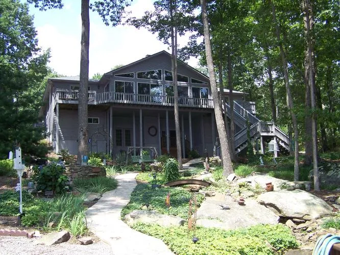 Lakefront! Enjoy the lake from inside comfort.Home boasts spacious rooms, awesome lake views, serene backyard sitting that will make you feel like you are at"Biltmore Gardens, "constant running creek, 3-Bridges, Pond & Waterfall.A completely perennial garden w/A Beautiful Stone Walkway to the lake.2-Fireplaces for your enjoyment.Home has had Excellent Care, Professionally Decorated inside & out.Designed for 1-Story Living.Guests won't want to leave when they experience the Beautiful view of Lake, Sounds of Running Creek & private deck overlooking beautiful gardens, dock, fire-pit & gazebo. MUST SEE!