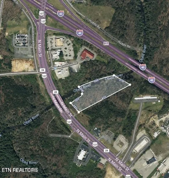 5.6+/- acres on Main St in Crossville just off I-40 exit 317. Approx 550' of frontage on the Obed River. High traffic area between Chick-fil-A and Cracker Barrel. All utilities are available. Call for more information!