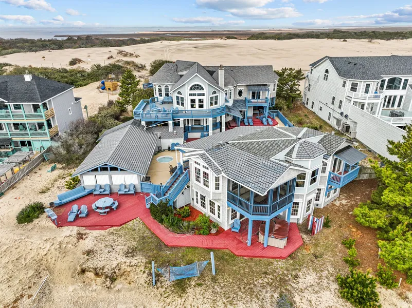 Oceanfront Estate! Views! Privacy! A One of a kind 2.77 acre, 3 building estate that is situated on the Oceanfront near Penny's Hill in the 4 wheel drive beach of Corolla. X Flood Zone and 23 foot elevation! The panoramic ocean to sound views are some of the best on the entire Outer Banks and you get to enjoy sunrises and sunsets from almost every seat in the house. The estate's three buildings form an enclosed courtyard around the huge swimming pool, kiddie pool & play lounging area. A great place to spend an Outer Banks summer afternoon! This is outside living at its best and is complimented by a huge screened-in pavilion, an endless amount of covered decking and sun decking, an oceanfront gazebo and two hot tubs. Inside the main home you will find large comfortable spaces, wonderful bedroom suites, a gourmet kitchen, an elevator, theater room, amazing decking and views. The guest hous...