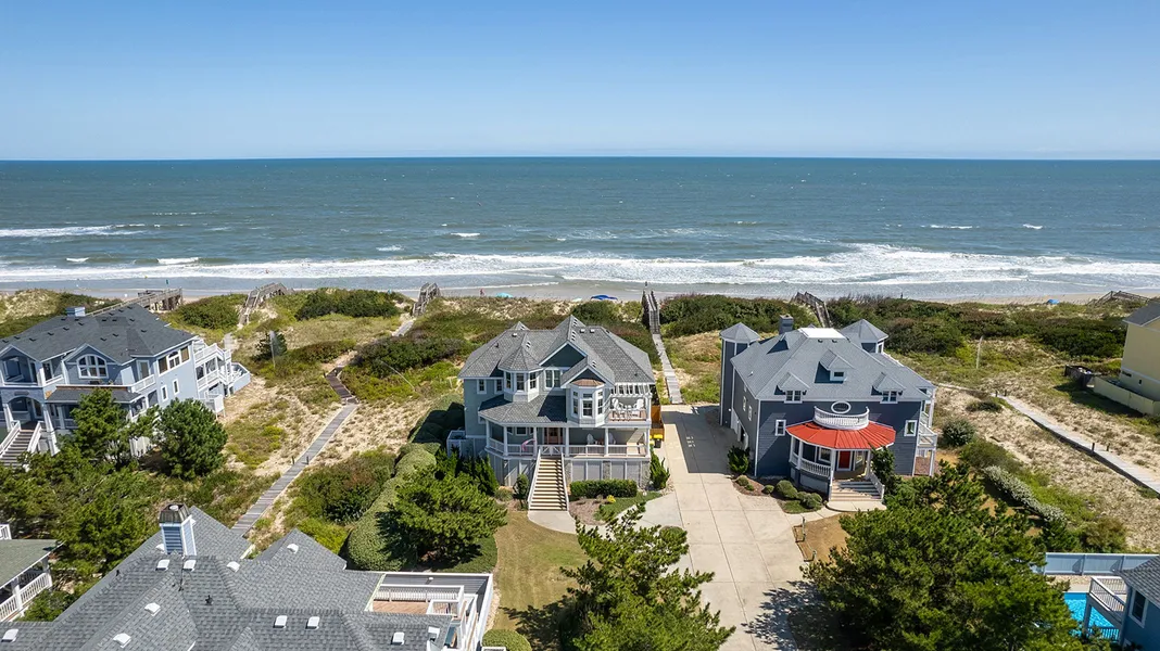 WOW!! STUNNING BUCK ISLAND OCEANFRONT! PANORAMIC AND BREATHTAKING VIEWS! RENOVATED/UPDATED/BEAUTIFULLY FURNISHED! NEW PRIVATE POOL! Welcome to this magnificent oceanfront haven, located just steps from the beach in the Corolla’s captivating Buck Island community. This thoughtfully designed home blends modern luxury and laid-back coastal living, featuring 5 bedrooms, 5.5 bathrooms, and expansive outdoor spaces perfect for entertaining or relaxation. Outdoor Oasis & Versatile Living Spaces: The ground level is made for fun and relaxation, boasting a convenient, spacious family room directly adjacent to the alluring outdoor space. Step outside to find a relaxing, brand-new pool surrounded by an expansive new deck, and the region's wonderful native plant life and the ocean dunes. Located just off the pool area is a shaded seating area with a wonderfully equipped outdoor kitchen and barbecue that is absolutely perfect for hosting summer gatherings or creating outstanding family meals. Inside, a full bathroom on this floor adds more convenience, and the cozy family room makes it easy to relax after a day in the sun. On the second level, you’ll find four comfortable bedrooms. The first bedroom offers access to the outdoor deck that directly overlooks the pool, and is a perfect spot for enjoying morning coffee surrounded by the glow of the sunrise and the sound of ocean waves. Two more bedrooms share a well-designed bathroom, with one of those bedrooms featuring charming full-size bunk beds and a view of the ocean. The highlight of this floor is the large fourth bedroom that includes a large sliding glass door opening to the deck with ocean views, and an en-suite master bath complete with a standing shower and ample storage, including a linen closet. With breathtaking ocean views, the top floor is a showstopper, featuring an open, airy living space with vaulted ceilings that enhance the room’s openness. The large living room offers sweeping ocean panoramas through its many expansive windows, while a sliding glass door leads out to a deck that overlooks the beach. The kitchen is modern and with well-appointed appliances plus ample cabinet and countertop space, and an adjacent more formal dining area provides plenty of room for gathering for meals with family and friends. The master bedroom suite on this floor is a true luxury retreat, offering brilliant sightlines of the Atlantic Ocean from the room’s large windows, and ease of access to the floor’s sweeping outdoor deck. A truly spa-like en-suite bathroom complete with double vanity, large standing shower, and a soaking tub perfectly positioned to take in the ocean vistas complete this outstanding bedroom. For those more quiet moments a small flight of stairs leads to a charming sitting area, ideal for reading and overlooking the neighborhood, completes the home’s incredible third floor. Location and Surrounding Area: 791 Columbia Road is located in Buck Island - a picturesque, semi-oceanfront and beautifully landscaped gated community in the heart of Corolla. Here you’ll have access to the community swimming pool, tennis courts and playground, and you’re a short walk to delicious restaurants, the grocery store, and to boutique shopping of Tim Buck II. This community is also just a few minutes drive south of historic Corolla with the Currituck Lighthouse, Historic Whalehead Club and Park, and more of the town’s other shopping and dining options. This home is perfect for those seeking a luxurious beachside retreat in one of the Outer Banks' most sought-after locations. Whether you're looking for a permanent residence, a vacation home, or an investment property, 791 Columbia Road offers everything you need for the ultimate coastal living experience.