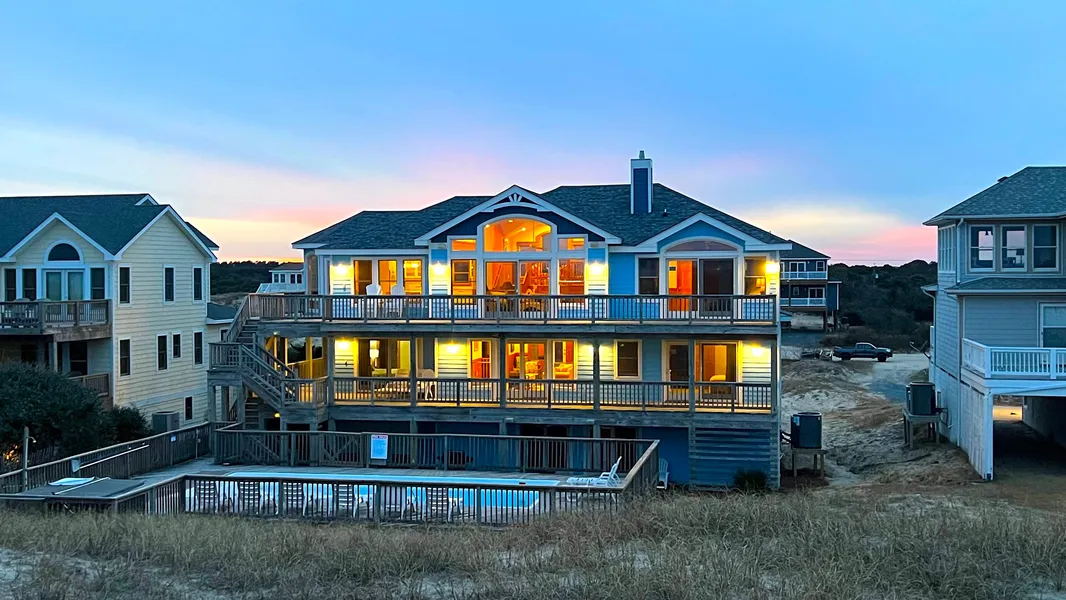 Welcome to your custom oceanfront retreat, offering breathtaking views of the Atlantic. Nestled behind a protective double dune line, this spacious six-bedroom, six-bathroom home is perfectly designed for celebrating the wild and wonderful 4x4 area of Carova. A consistent rental earner with 2025 projections over $120,000. Step outside, where stallions graze beyond the sparkling blue waters of a large private pool. Inside, the top-floor living area features soaring ceilings and awe-inspiring ocean views. The open-concept design includes intimate nooks for creating daily memories, while a lofted gaming area provides elevated views—perfect for cocktails and camaraderie. The expansive kitchen offers ample space to prepare festive meals, which can be enjoyed around the oversized dining table. Adjacent to the kitchen, a sunroom and cozy reading nook lead to a large deck, ideal for morning co...