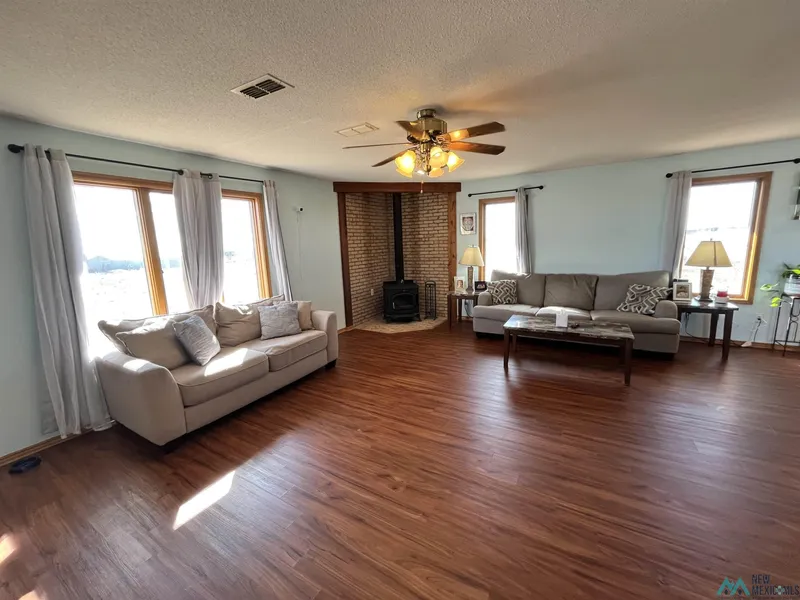 This beautiful and private country home on close to 10 acres is all you need to enjoy the sunrises and sunsets in Clovis, NM. Spacious and serene natural landscapes surround the property of this large brick home. You'll find a great kitchen with plenty of cabinets, electric stove island, and window looking out to the horizon over the sink. Wood burning stove in the family room to keep you warm and cozy. There is a Separate dining room with large window, also a nice bar area with bench to eat in the kitchen. Large Laundry room with access to backyard. Master bedroom has sliding glass door to outside deck, walk in closet, and attached full bathroom with tub. Both bathrooms have double sinks. 2 Car Detached Garage, and separate 1 Car Garage, 1 train car, and 1 small open shed for livestock. Seller offering $2000 in closing cost assistance.