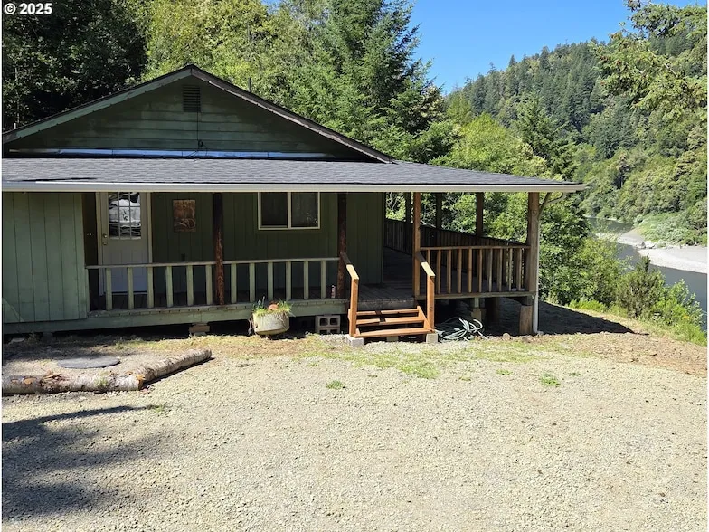 Great cabin in the Wild and Scenic section of the Rogue River- VERY RARE! This one bedroom and one bath home has an open living/kitchen area with sweeping views of the Rogue River and surrounding canyon/mountains. Located just downstream from Rachels Delight Riffle with a large stretch of riverfront property, this is an outdoorsman's paradise! New roof in 2025. Updated with Laminate flooring in living room and bedroom. Pine T&G Ceiling in living room. Kitchen has an eat at bar, built in microwave, full size range and refrigerator. Big laundry room with washer/dryer and sink. Brand new GAF composite shingle roof. Sand bar at the river and 2 creeks on the parcel as well.