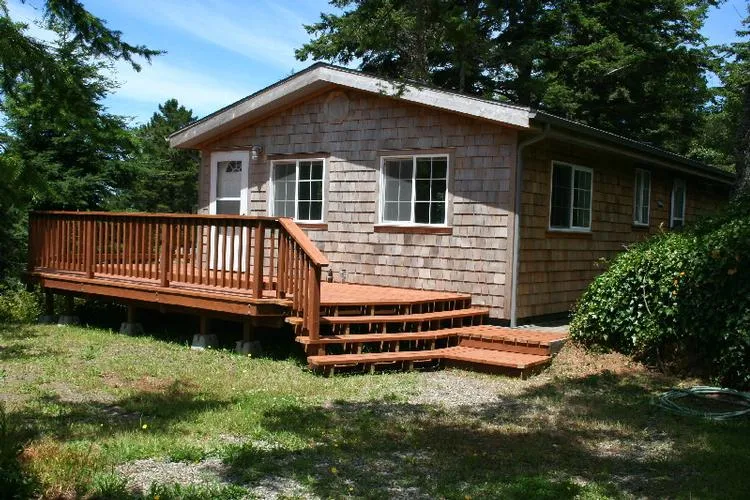 Cedar-shingled MFH bungalow with a wrap-around deck overlooking the town (with a peek of the sea), yet tucked away from sight. The floor plan is open with a den, 2 bedrooms, 2 baths, with a potting shed and extra half bath adjacent. It is a short walk to the beach and downtown area. Owner will carry a contract with a qualified buyer.