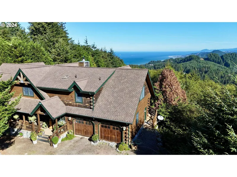 Price Reduced! This stunning 3-bedroom, 3-bath custom log cabin offers breathtaking ocean, mountain, and river views. The home boasts Pennsylvania White Pine throughout, vaulted ceilings, granite countertops, custom cabinets, and hardwood floors. Enjoy the luxury of stainless steel appliances, including a gas range, and a beautiful custom fireplace in the great room. Each primary bedroom has its own private deck & bathroom. Fully furnished! Additional features include a loft, a theatre room, a covered front porch, and a spacious Oceanview deck perfect for entertaining. The property also includes a 2-car attached garage, a large detached garage, and ample parking for RVs, boats, and more (5 Parking spaces).For outdoor enthusiasts, the 5.2-acre property offers a fenced raised-bed garden with a greenhouse and plenty of room to explore. Outdoor patio with fire pit. Located in a quiet, desirable neighborhood, this property is just out of the coastal fog, offering the perfect balance of privacy and scenic beauty.