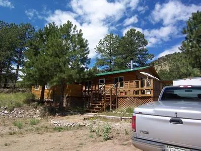 M&TJ66 - ROSITA LOG CABIN GETAWAY - Get away from the maddening crowds in the historic little village of Rosita, Colorado. This 1,232 square foot cabin is very roomy, with a nice open floor plan for living and dining areas, a good sized office or extra bedroom, large master bedroom and one bathroom. It also has a very nice detached single car garage. The property is nicely wooded with tall ponderosa pine trees. The big deck is great for entertaining or watching wildlife. Custom tile adds great character to the kitchen and bath areas. Hardwood floors and two woodburning stoves make for a very cozy cabin. There is also propane heat in case you don't want to stoke up the woodburning stoves.