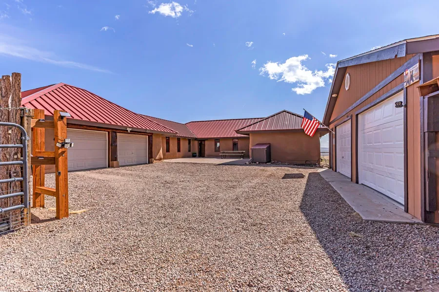The thoughtfully designed, energy-efficient, southwest-style hybrid home is a true masterpiece, blending post-and-beam construction with hay bale insulation (R-53) and SIP roofing (R-17). The interior boasts earthen plaster walls, stucco exterior, concrete floors, and in-floor radiant heat, complemented by a cozy wood-burning stove. A charming center courtyard with brick pavers and a latilla fence provides the perfect space for soaking up the sun or hosting gatherings. This single-level home features three bedrooms, two bathrooms, a spacious utility room, a bonus room (ideal for an office, TV room, or den), and an expansive great room that flows seamlessly into the kitchen. The kitchen is a chef’s dream, offering new tile flooring, an island with seating for four, and high-end stainless steel appliances, including a propane stove and oven. Additional improvements include an attached heated two-car garage, plus a detached oversized two-car garage with a workshop area, perfect for any hobbyist or equestrian enthusiast.