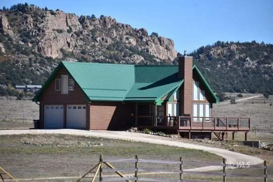 Panoramic views of the majestic Sangre De Cristos on 35 acres, this expansive log-sided home offers an unparalleled mountain retreat. 2 story windows make the home bright and the mountain views big! Offering 3 Bedrooms AND an office/4th bedroom, the open floor plan seamlessly integrates the kitchen, dining, and great room with cozy gas fireplace. The kitchen features granite countertops, stainless steel appliances including double ovens for those culinary masters or large gatherings. The entire upstairs is a comfortable master retreat with ensuite bathroom, AND adjoining bonus room. Entertainment abounds with a media room downstairs, complete with a pellet stove. Whole house radiant in-floor heat ensures cozy warmth throughout. For the hobbyist or outdoor enthusiast, an attached two-car garage AND separate 20x25 garage/shop with power, parking, storage, and RV hookups for adventurers seeking to explore the great outdoors. The subdivision has private access to BLM lands and nearby Lake DeWeese. Gated entrance provides security & privacy for peaceful living. With its breathtaking mountain vistas this property offers the quintessential mountain lifestyle.