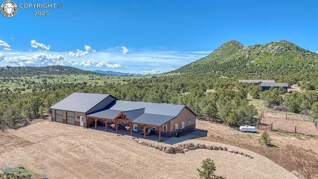 Settled into the quiet sweep of Bull Domingo Ranch, this 35-acre Colorado haven feels like it's been waiting for someone who understands the rhythm of the mountains. From the moment you arrive, the Sangre de Cristos rise in the distance like a painted backdrop, and the home itself feels rooted-steady timbers, mountain textures, and a porch made for watching daylight drift across the peaks. Inside, the great room unfolds beneath pine tongue-and-groove vaulted ceilings that glow with warm, golden light. It's the kind of space where conversations linger, meals stretch long, and windows frame the land as if it were a living mural. The kitchen carries that same handcrafted feel-rich wood cabinetry, expansive counters, and an oversized pantry ready for everything from big-batch cooking to stocking up for ranch life. Two comfortable bedrooms sit quietly to one side of the home, each offering a retreat of its own. The primary includes a walk-in closet, while the full bath blends practicality with rustic charm. An on-demand hot water system keeps everything efficient and easy, whether you're hosting a full house or simply ending the day with a long shower. Step outside, and the land opens around you. A stamped concrete covered patio invites relaxation, while pines rolling out in every direction, offer privacy, quiet, and the kind of deep stillness you only find in the high country. For horse lovers, the property is already thoughtfully set up with corrals and a sturdy shelter-well-planned, well-placed, and ready for your herd. And the massive 4-car tandem garage is more than parking; it's workspace, equipment storage, hobby room, and possibility all under one roof. Everywhere you turn, this property tells the story of Colorado living-honest, wide-open, timeless. Schedule a showing today and step into the next chapter of a life lived close to the land, surrounded by beauty, and grounded in the comfort of a home built with intention.