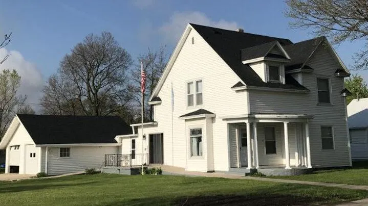 This home has beautiful woodwork throughout! The parlor has an open staircase. Living room and formal dining space. The dining room has been used as a main floor bedroom. Patio doors provide lots of sunshine for the kitchen. Main floor laundry. Upstairs has a second bathroom and three bedrooms. All bedrooms have walk-in closets. The furnace and air conditioner are only two years old. Shingles, gutters, and siding were new last year. Attached double garage. A smaller home could be used as a rental or guest home. This home sits proudly on six lots and was originally built in 1920 by Albert Pinkley who was a depot agent for the railroad. The current owner is only the third owner of this property. Come see the charm!