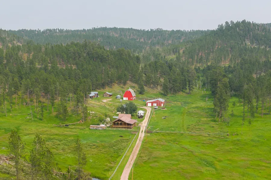 This Beautiful 53 Acre Black Hills Treasure Awaits You. This home is Nestled in the Heart of the Hills, surrounded by USFS & just a 10 min drive to Custer State Park. Current Original Log Cabin was built in 1910 & is in great condition, it is now adjoined by a breezeway to a custom built home. The custom built home boasts; cathedral ceilings, log interior, custom doors, rock fireplace built from native stone, new flooring and a beautiful open living concept. Drenched in sunlight, the picture windows look out onto a wraparound covered deck. Log cabin has an office/bonus rm, 2nd kitchen/laundry rm, 1 bath with bedroom & walk-in closet. Historical root cellar just off winter mud rm. New addition has 2 large bd rms, 1 ba, large kitchen with antique cook stove. Ranch yard leads you to a bunkhouse with 3 guest quarters fully furnished with full baths, sleeps 8. Full kitchen & bath in main bun...