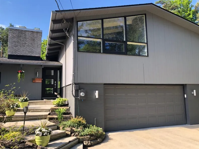 Rare find. One-of-a-kind mid-century modern in the heart of Pepper Pike. Walk through the front door and a magical view of the garden oasis and in-ground pool awaits. This light-filled gem sits on a 1.5 acre corner lot surrounded by mature trees and lush landscape. Enjoy your private oasis and yet be only minutes from area schools, shopping and dining. Post and beam architecture, acacia walnut floors, open sight lines and walls of glass feature throughout. Enjoy the stunning granite kitchen with ambient lighting, new GE Caf double ovens with wi-fi, Samsung gas cooktop, Subzero refrigerator and wine cooler. The south facing living and dining room is flanked by a wall of windows showcasing seasonal beauty throughout the year. Enjoy the convenience of the wi-fi remote gas fireplace in cooler weather. The adjacent family room with modern epoxy floors and half bath is the perfect place to cat...