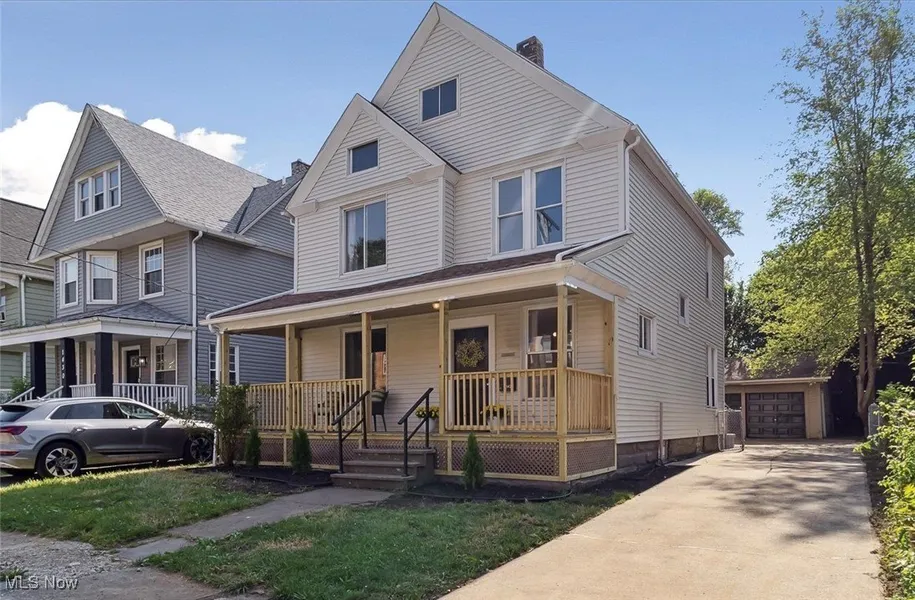 Stunning Remodeled Colonial in Prime Location Near Gordon Square and Lakewood. Step into timeless charm and modern luxury with this beautiful home offering 4 spacious bedrooms, 1.5 stylish baths, and thoughtfully updated living spaces throughout. A newly rebuilt solid wood front porch welcomes you into the home's grand foyer highlighted with a classic stairwell and trending chandelier setting the tone for the impressive character within. An Arched Entryway frames the large, moody living room-the perfect retreat with its rich tones and faux-fireplace creating an elegant atmosphere to spend special evenings ahead. The modern dine-in kitchen is bright and spacious, featuring brand new cabinetry, quartz countertops, and sparkling new appliances-ready for everyday meals, meal-prep routines or entertaining. Just off the kitchen, you're sure to love the convenience of main-floor laundry, complete with a new washer and dryer, custom butcher block countertop, additional storage, and a hanging rod for air drying. The dramatic half bath is a total vibe with color-drenched Naval Blue walls, brass accents, feature-lighting, shelving and blue velvet floor-to-ceiling drapes. The adjacent bonus room, currently shown as a home office, completes the well-appointed first floor. Upstairs, you'll find four generous bedrooms, a fully updated bathroom, and a walk-up attic offering potential for future expansion or creative use. The basement is unfinished (all the amenities are upstairs : ) The fenced-in backyard with a patio area provides low-maintenance yard space (which could be accented with grass, crushed rock or ground cover), and a detached two-car garage with ample additional parking. Located just minutes from Downtown Cleveland, Edgewater Park and Cleveland's Biggest Lake Erie Beach, this home blends historic charm with modern amenities in one of the city's most burgeoning areas. Don't miss your chance to call this one-of-a-kind Colonial 'Home'. Schedule your showing today!