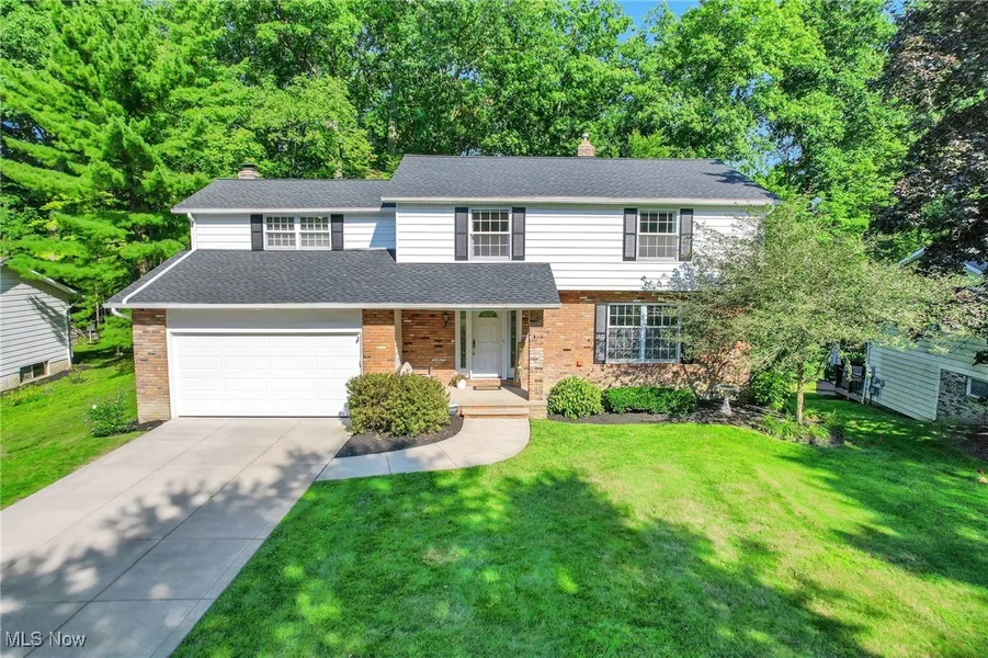 This updated colonial sits on a private wooded lot in a highly sought-after Solon neighborhood. Thoughtfully improved inside and out, the home blends classic design with modern comfort. The first floor features refinished hardwood floors throughout, a main staircase with matching hardwood, fresh interior and exterior paint, crisp white trim, and newer carpet in select areas. The living and dining rooms are filled with natural light from Pella windows and enjoy scenic wooded views. The renovated kitchen offers stainless steel appliances, a custom center island with bar seating, a large pantry, tiled backsplash, and an open floorplan connecting to the family room with its wall-to-wall brick fireplace. The main-level bathroom has also been renovated with updated finishes. Sliding doors lead to a newer wood deck and paver patio—ideal for relaxing or entertaining—overlooking the backyard. Additional updates include a 2024 roof, newer driveway and walkway, freshly landscaped yard, and newer garage door. Upstairs, the primary suite includes a remodeled bath with double sinks, a tiled shower, and a walk-in closet. Three additional bedrooms, including a large room over the garage, share another updated full bath. The finished lower level provides flexible living space, laundry, and storage, with a walk-out to the backyard. Located near schools, parks, the recreation center, and shopping—this home is ready for its next owner to enjoy.